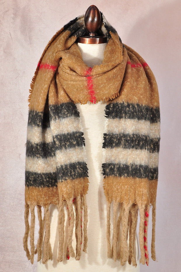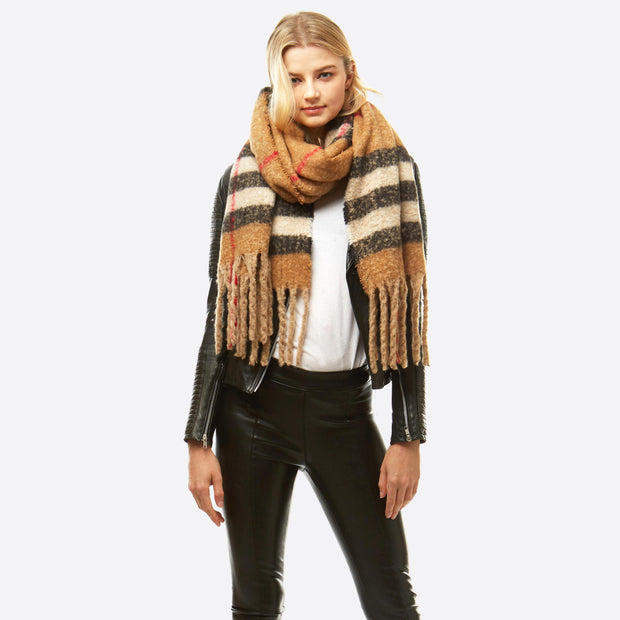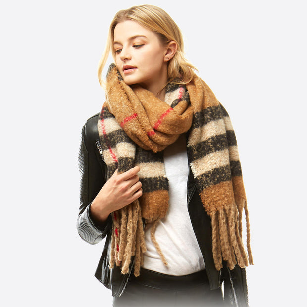 Oversized Plaid Print Oblong Scarf Featuring Tassels.